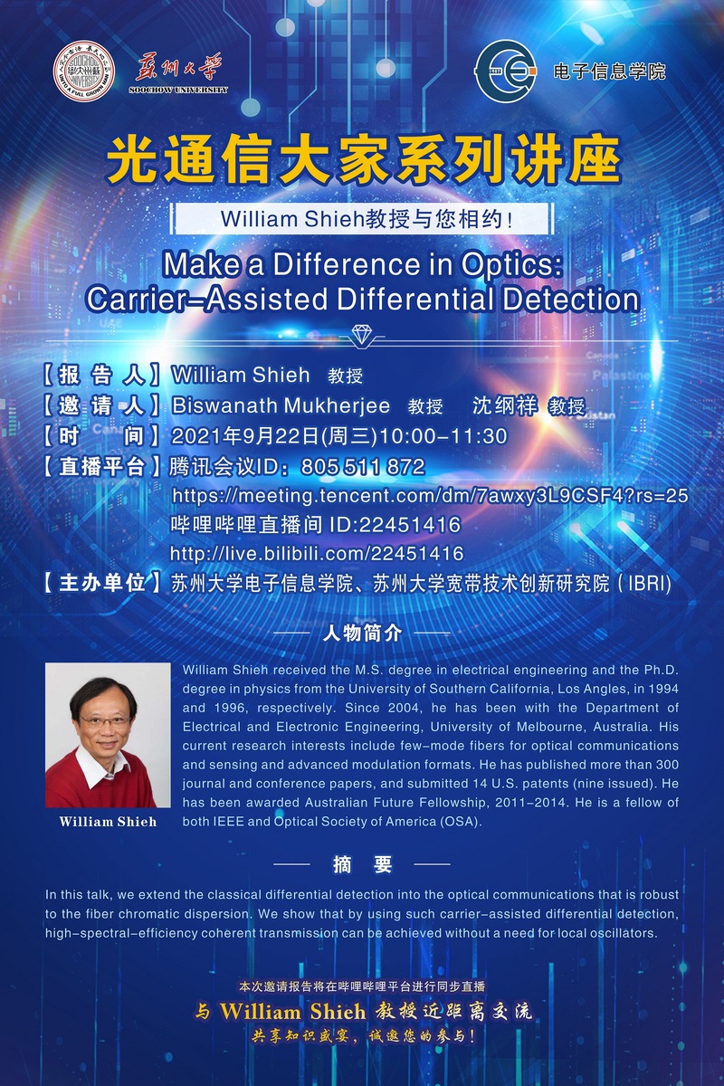 光通信大家系列讲座| William Shieh教授与您相约!