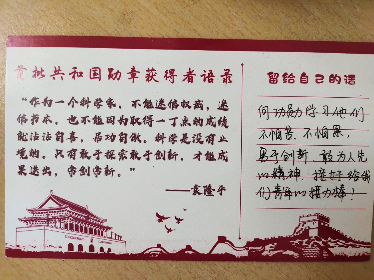 为进一步深化同志们对铸牢中华民族共同体意识,党日活动的最后为每位党员同志送上了印有首批获得共和国勋章的英雄前辈们的光辉事迹,以及他们坚定的理想与掷地有声的感悟。在学习他们身上勇于探索、科创报国的伟大情怀的同时,每位同志都写下自己科技创新、矢志报国的青春承诺,激励自己不断前行。