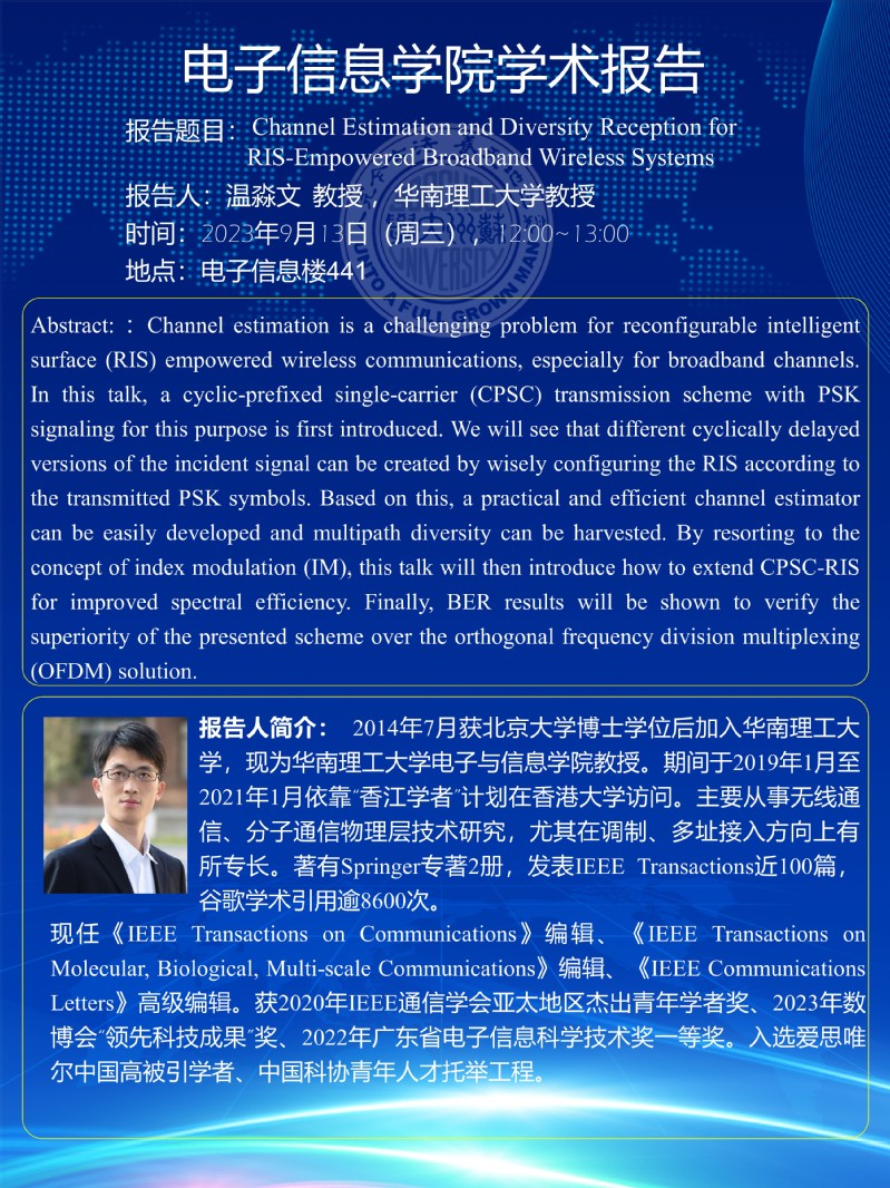 【学术报告】Channel Estimation and Diversity Reception for RIS-Empowered Broadband Wireless Systems