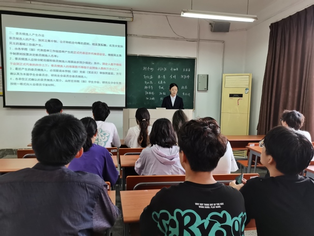 许琳馨同学讲解了学生代表大会的意义和作用,着重强调学代会代表着同学们的民主意志,同学们手里的每个选票都承载着重大意义,大家应当神圣地将手里的选票投给最适合的人选。同时,许琳馨向与会人员介绍了正式代表产生条件,并阐述了正式代表的选举方法。