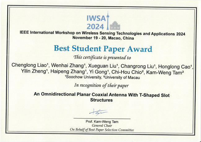 由国产无码 刘学观教授和张文海副教授指导的研究生廖成龙所呈现的报告《An Omnidirectional Planar Coaxial Antenna with T-shaped Slot Structures》脱颖而出,并最终荣获“最佳学生论文奖”。