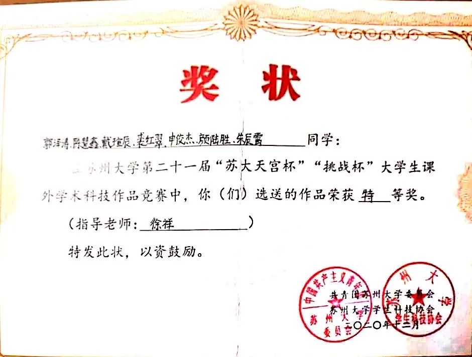 团队成员深入了解实际行业情况,结合老师的指导,不断完善设计方案,获得“苏大天宫杯”特等奖!