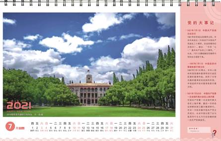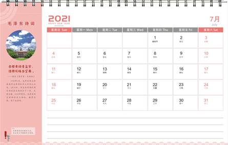 习近平总书记说:“对我们共产党人来说,中国革命历史是最好的营养剂。多重温这些伟大历史,心中就会增加很多正能量。”台历的设计理念是精选党史上每个月份的大事件,与党建知识问答、毛泽东诗词、学生的校园摄影作品、月历融合为一体,且党史知识部分可以单独裁下作为书签保留。