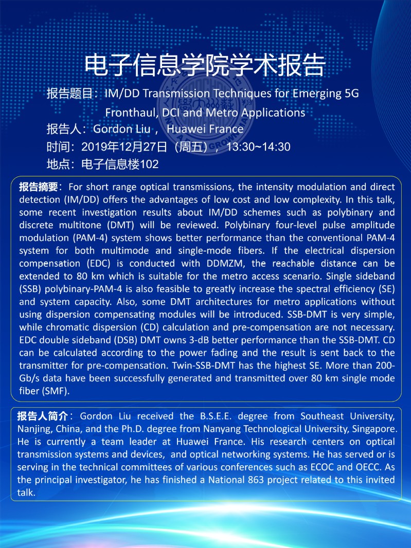 学术报告:IM/DD Transmission Techniques for Emerging 5G Fronthaul, DCI and Metro Applications