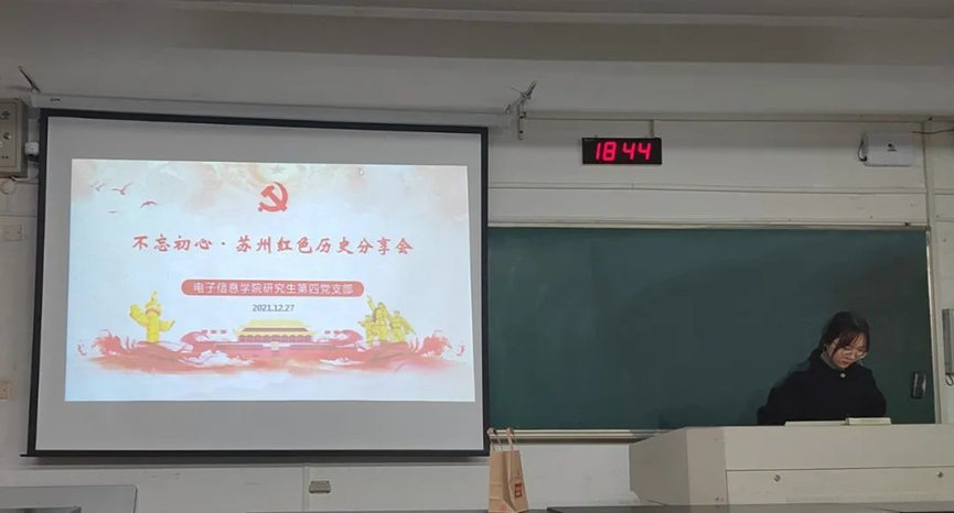 历史是最好的教科书,也是最好的清醒剂。透过历史回望走过的路,从历史中汲取智慧和力量,向来是我党的优良传统。电院研究生第三党支部和第四党支部积极开展党史学习教育,在12月开展了以“不忘初心、砥砺前行为”主题的苏州红色历史分享党日活动。