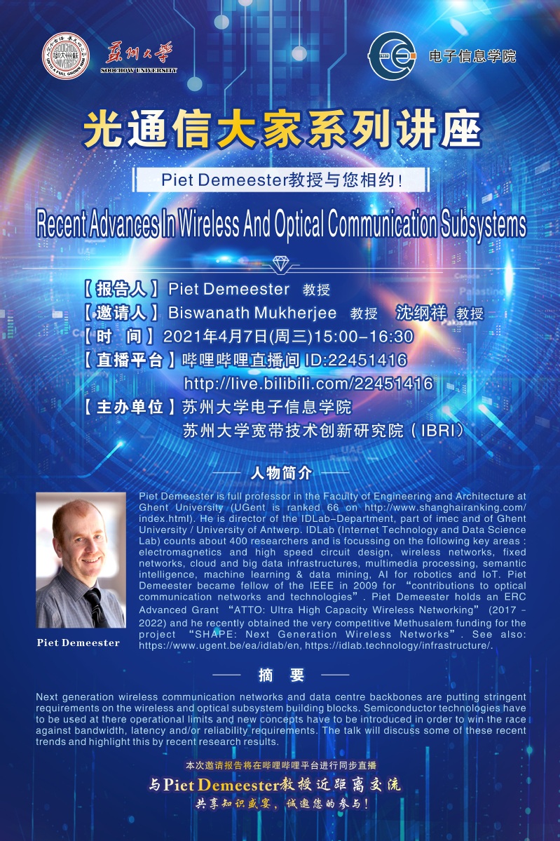 光通信大家系列讲座| Piet Demeester教授与您相约 !