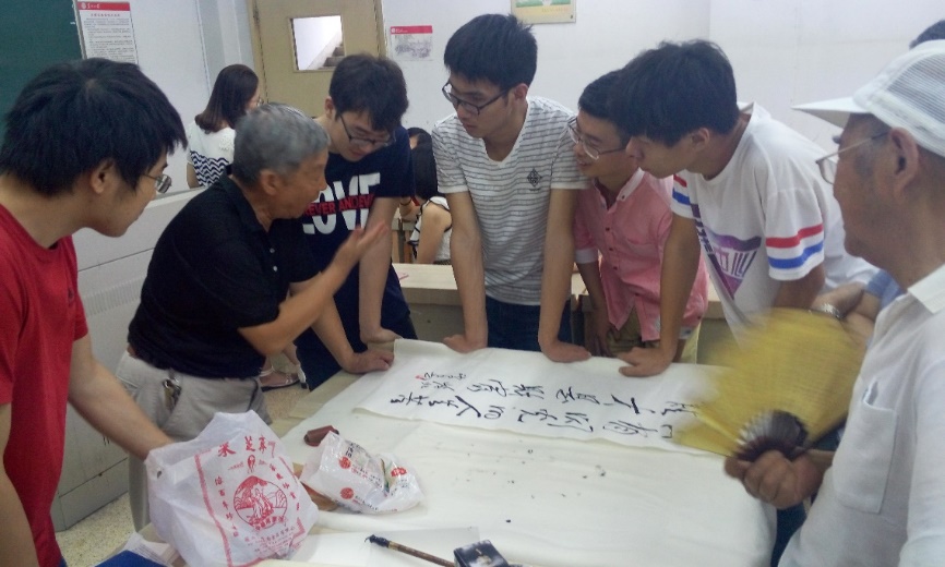 下一个环节是书法表演,爱好书法的老同志们带来了一些自己珍藏的书法作品来与我们分享,周学良书记等老同志也在同学们的围观中给我们表演了书法的艺术,同时还细心地跟同学们解释各种书法的区别,以及如何写一手好的书法,同学们遇到心仪的作品也积极和作品的作者进行交流,有的老同志甚至当场赠予作品,勉励青少年勿忘党恩,不断前行。