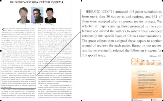 ICCC是由IEEE和中国通信学会合办的国内通信方向的旗舰会议。本次会议吸引了来自30多个国家和地区的405篇论文投稿,其中161篇论文被会议接收,会议技术委员会在所有被接收的论文中根据评审分数选出了20篇文章邀请向专刊投稿,最终只有8篇论文被接收刊出在最近一期的《China Communications(中国通信)》的特刊中,高丽同学的这篇文章就是其中的一篇。