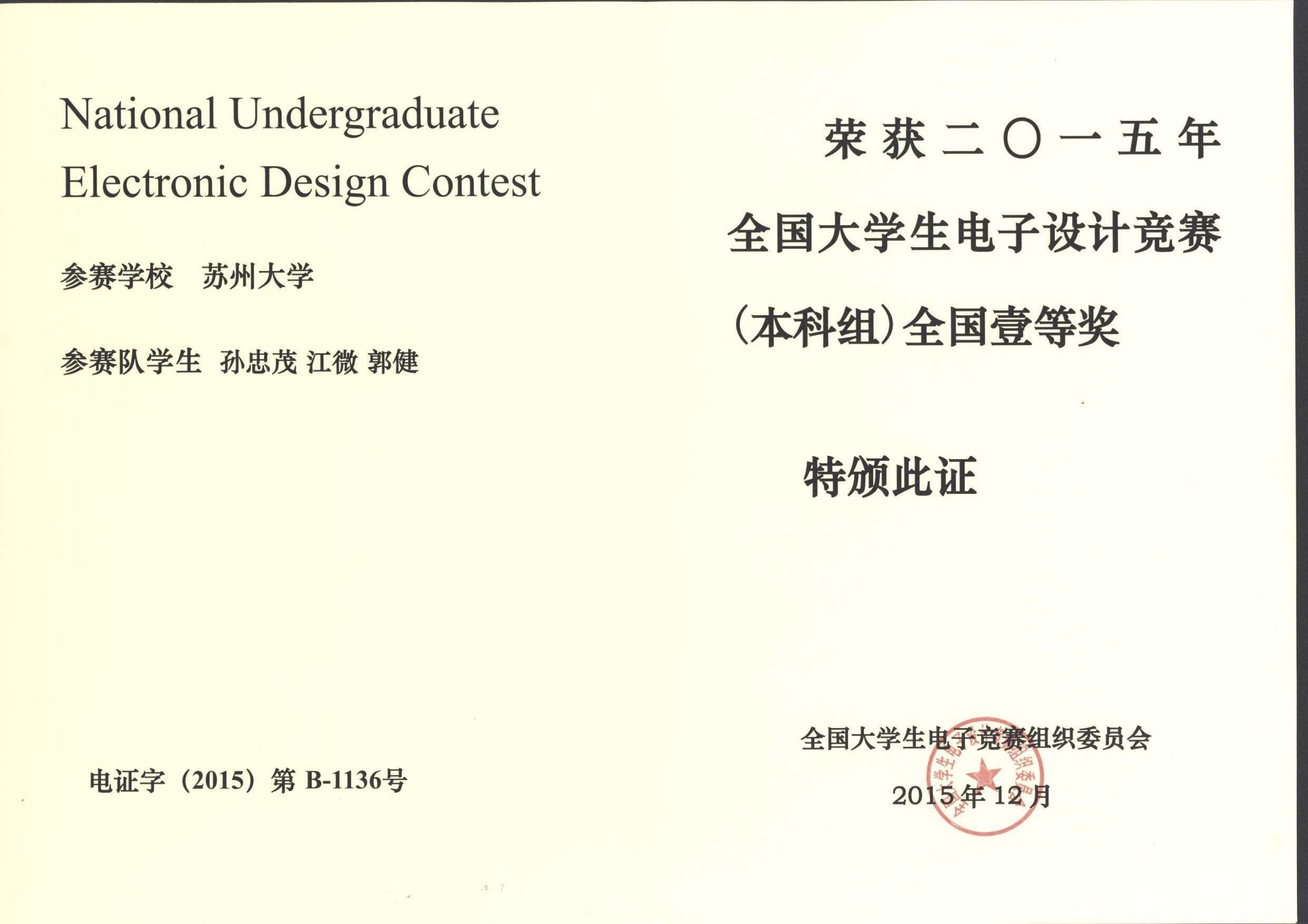 全国大学生电子设计竞赛一等奖证书