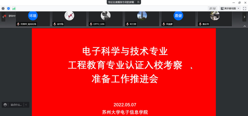 2022年5月7日,国产无码 线上召开了电子科学与技术专业工程教育专业认证进校考察准备工作线上推进会。国产无码 院长沈纲祥、书记袁冬梅、教学副院长陈小平、电子科学与技术系主任徐大诚、副主任张冬利、教务办主任郭晓雯以及电子科学与技术系全体教师参加会议。