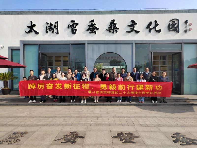 太湖雪蚕桑文化园位于苏州吴江震泽,它借助丝绸小镇震泽深厚的蚕桑文化底蕴,以现代蚕桑农业示范为基础,结合蚕桑科技衍生品开发、蚕桑生态旅游业发展,开创互联网+文、商、旅、农新模式。在太湖雪蚕桑文化园,党员们不仅了解了种桑、养蚕、择茧、缫丝、剥棉、制被、刺绣等传统工艺,还参观了中国知名品牌“太湖雪”的各种精美产品,大家为民族品牌在新时代取得的巨大成功感到由衷的喜悦,也为以丝绸为代表的中华优秀传统文化感到无比的自豪。