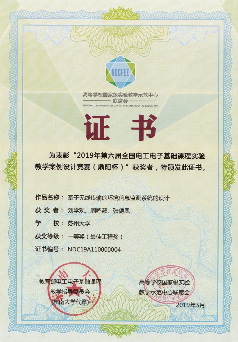 在日前举办的第六届“鼎阳杯”全国电工电子基础课程实验教学案例设计竞赛中,国产无码 刘学观、周鸣籁、张德凤等老师设计的《电子系统综合设计》教案“基于无线传输的环境信息监测系统的设计”获得一等奖暨“最佳工程奖”殊荣。